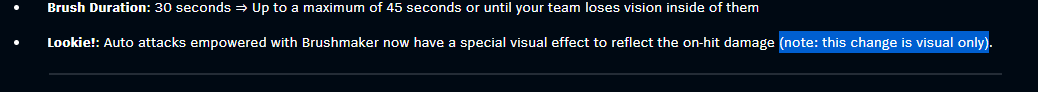 Overall, these changes let bushes be placed a lot less thoughtfully, since you don't have to worry about the consequences of your placement. I think these changes are good for the game as a whole, but I'll miss the skill expression of being able to place perfect bushes that benefit your team and only your team.
