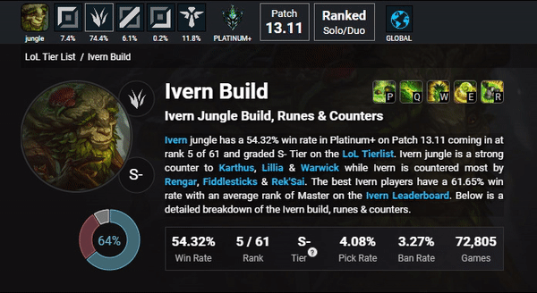 It's always a concerning situation for me when Ivern is strong. As an OTP, I'd much rather have my champion be slightly weaker than average (49.5% wr), since that's what draws the least attention. From here, all I can do is hope that Ivern lands in a playable state after the imminent nerfs.